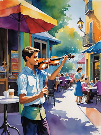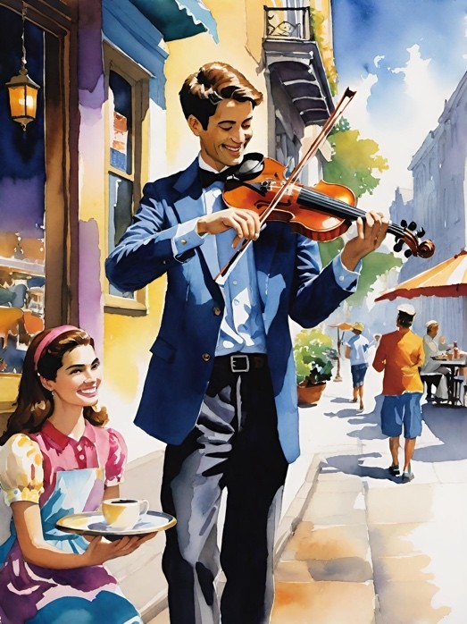 Beneath dawn’s blush, a boy stands, violin tight,
