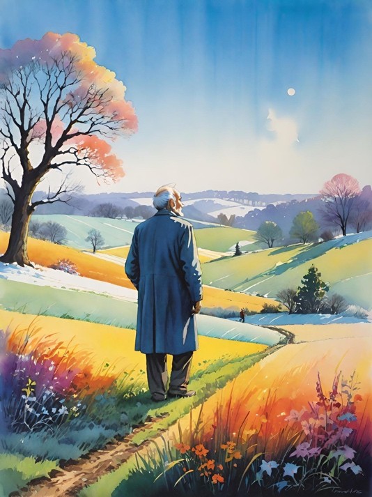 An old man stands in a field, alone,
