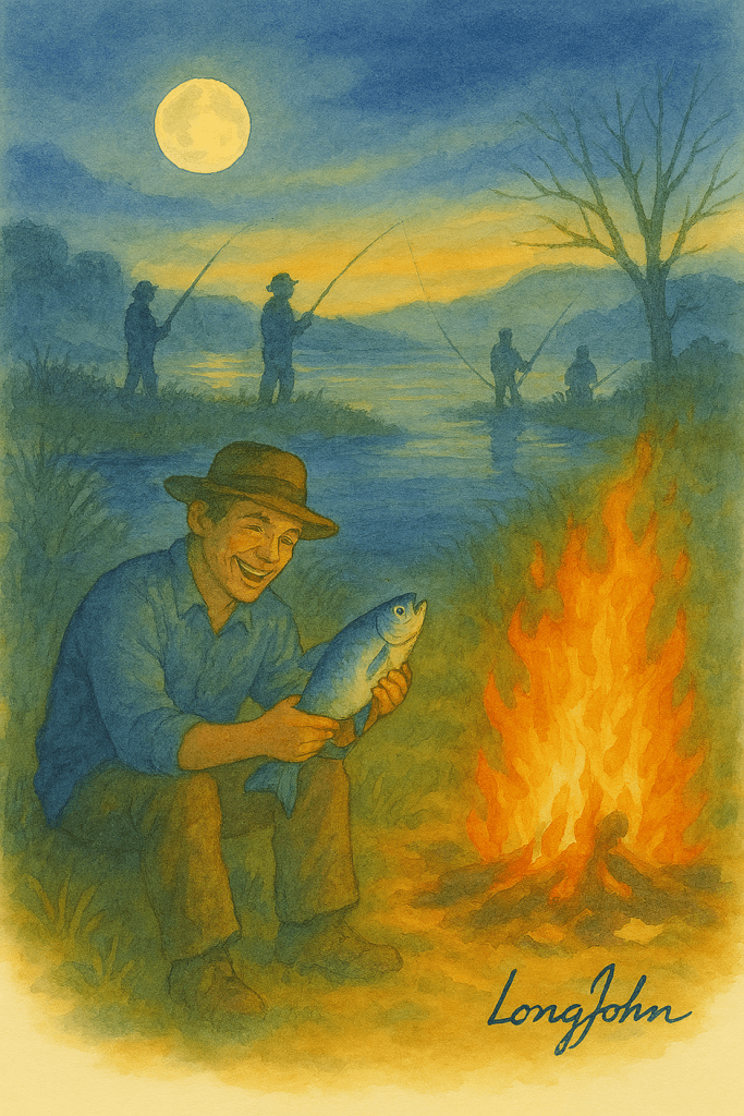 A joyful sequence celebrating the rhythm of river life—moonlight, patience, silver catch, and firelit feast.