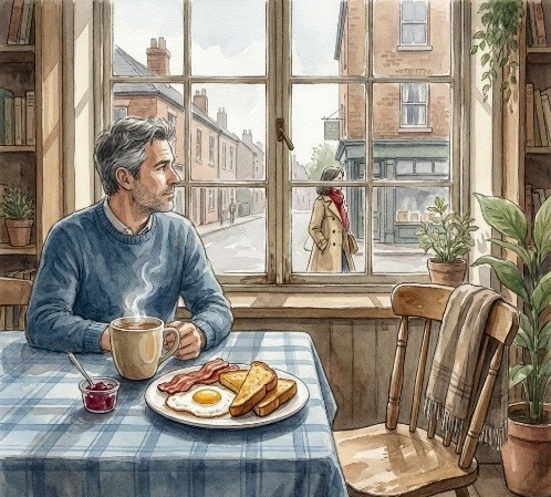 Each morning he returns to the same café window, where sunlight, steam, and routine soften the ache of an empty chair. With every cup poured and every glance toward the door, hope lingers—quiet, stubborn, familiar. A simple breakfast becomes a daily vigil for the smile he dreams will one day sit across from him.
