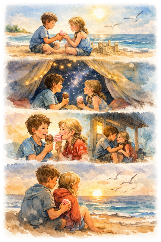 Sun-Drenched Memories is a tanka sequence capturing fleeting moments of childhood summers—bare feet on warm sand, melting ice cream, fireflies, and quiet promises beneath fading skies. Each verse preserves a small memory, where innocence, friendship, and the gentle passage of time meet by the sea.