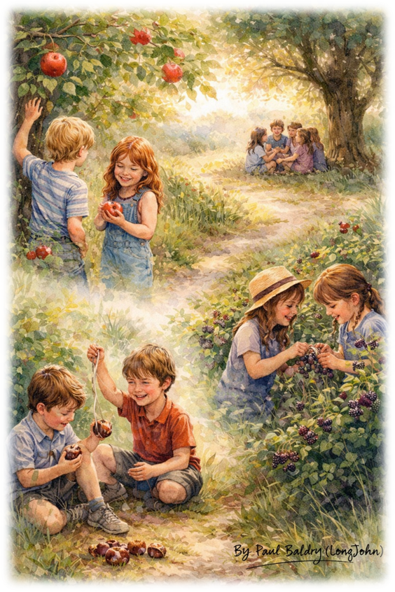 A walk through the hedgerows of childhood, where orchards glow, blackberries stain eager fingers, and glossy conkers promise playground glory.