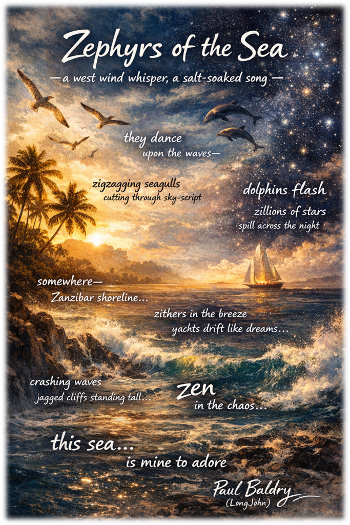 A west wind whispers across restless waters, where light fractures, dolphins flash, and stars spill wide. Between chaos and calm, the sea breathes, and in its rhythm, I find where I belong.
