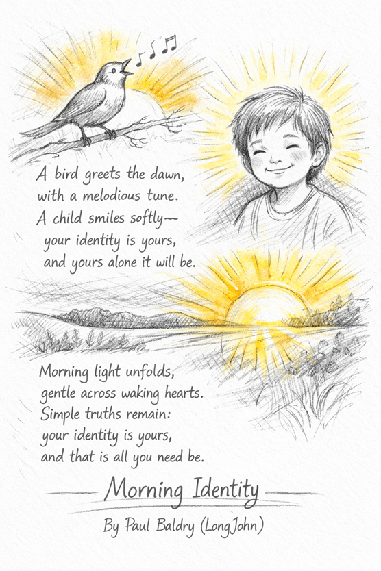 A quiet morning unfolds—birdsong, soft light, and a child’s gentle smile. In the stillness, a simple truth rises: identity is not given or taken, but wholly yours to carry, shape, and quietly own.