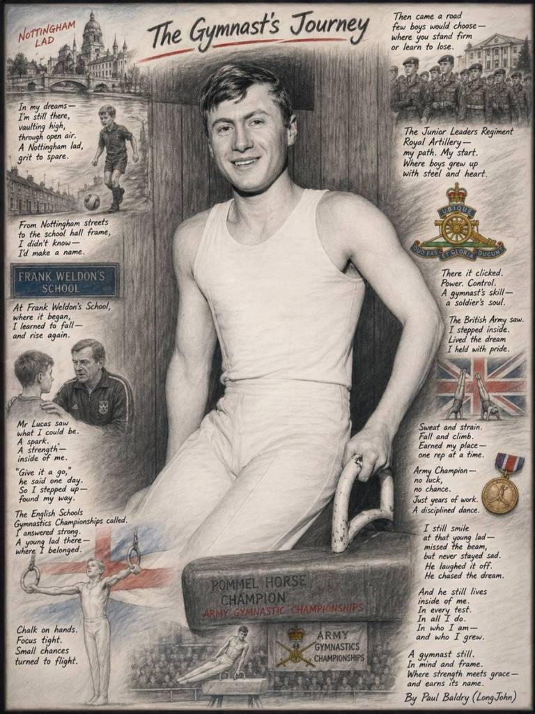 This poem is about my journey from a young gymnast in Nottingham to becoming Army Champion. The photograph alongside it was published in the Nottingham Post in 1971, after I won both the Pommel Horse and Trampoline events. Those early years were full of discipline, ambition, and dreams in motion. In time, my path shifted, and my Army career took priority—but the spirit of that young gymnast, and the dreams he chased, have never left me.
