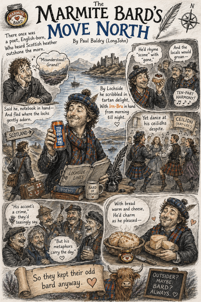 #MarmiteBard #ScottishPoetry #HumourVerse #LochsideLife #ExpatStories #LightVerse
